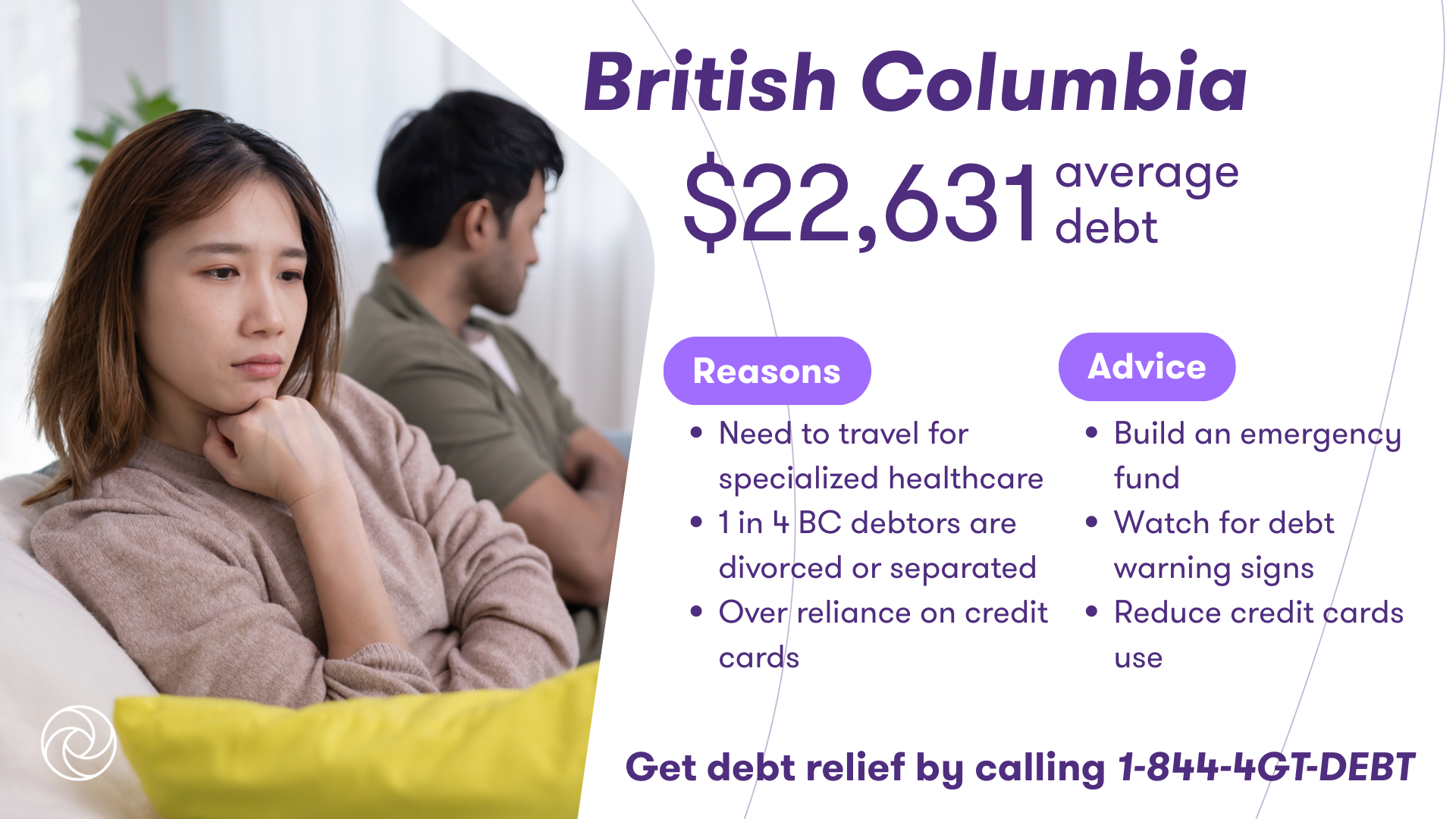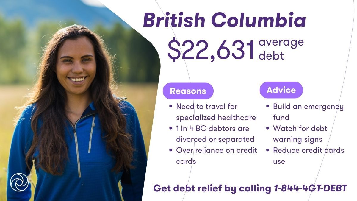 Marital breakdown. One in four insolvent British Columbians are divorced or separated. Credit cards dominate the debt landscape, accounting for 25% of reported debts, mostly from major banks. And while more than 10% of residents have tried solutions like consolidation loans, many need more aggressive debt management options.