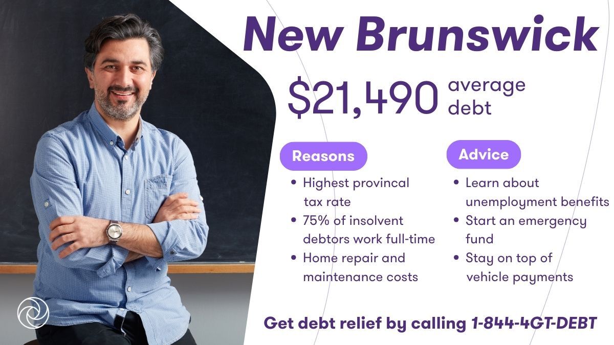 Lower income. New Brunswick also has lower wages than other provinces and is the highest taxed, which may make it hard to stay ahead. Three quarters of New Brunswickers that sought help from Grant Thornton work full-time yet still can’t afford all their expenses. Many residents rely on cars due to limited public transit and long distances between major cities, and list car loans and utility bills as common sources of debt. Adding to the strain, large companies have pulled out of the province, leaving gaps in employment and pushing more residents toward self-employment.