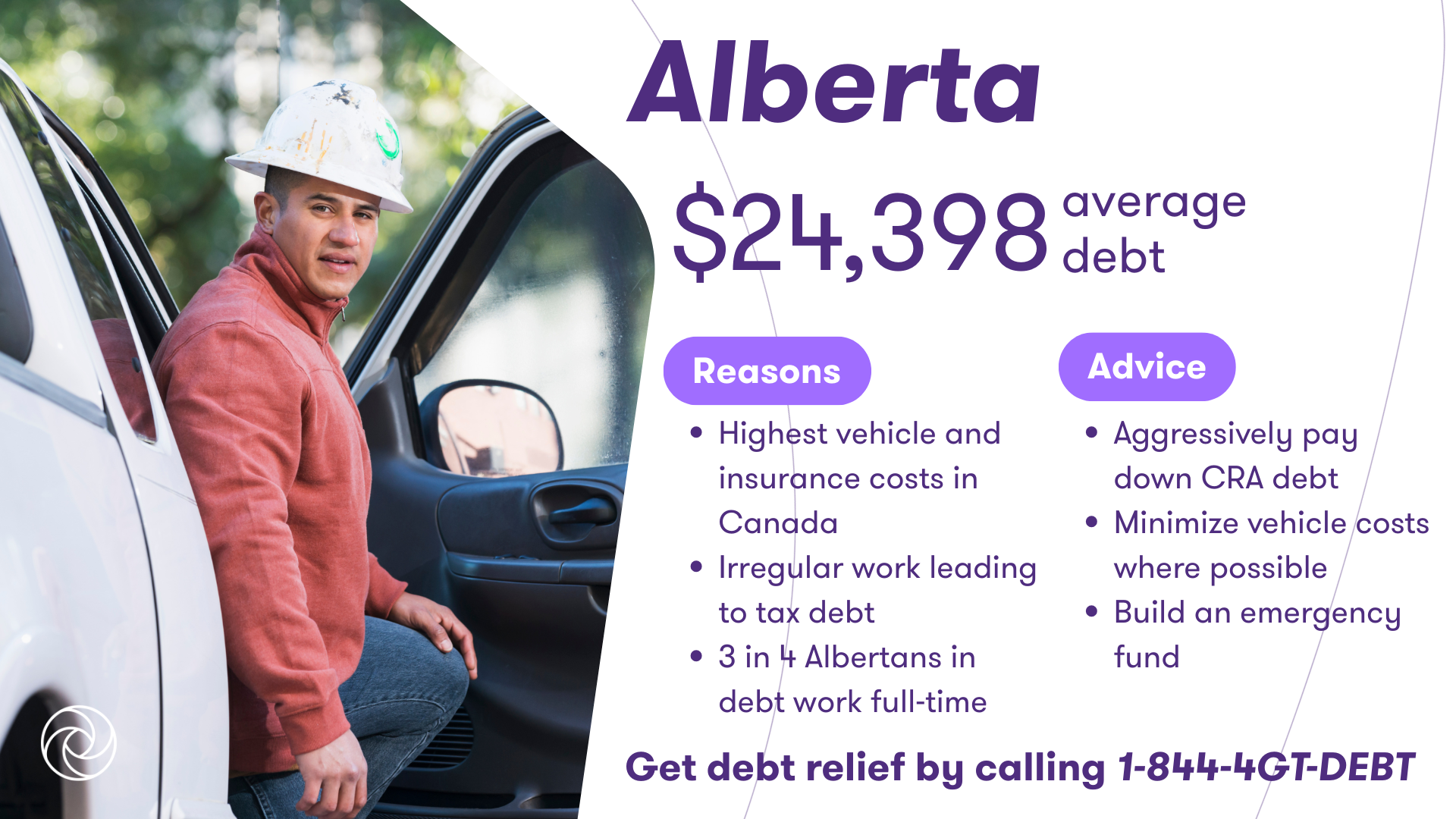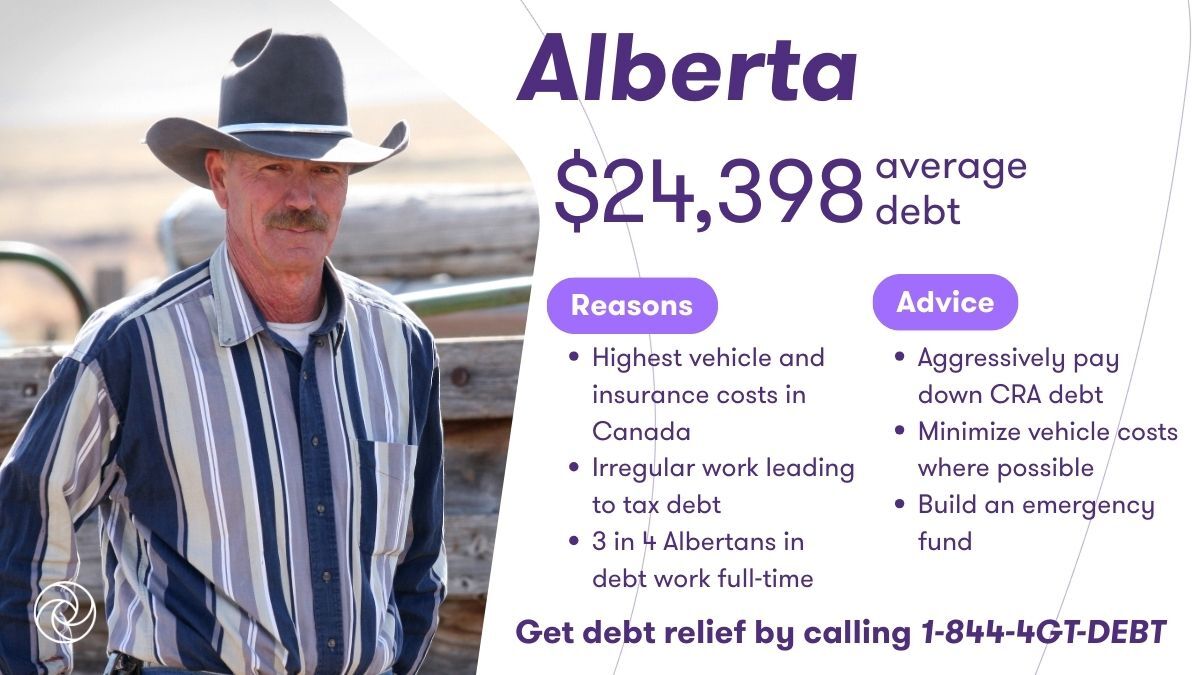 Low income. Full-time workers that seek debt help in Alberta earn less than the provincial average income of $74,237, and many residents are self-employed or work as contractors. Irregular or self-employed work can also lead to tax debt which one in five insolvent Albertan’s struggle with.